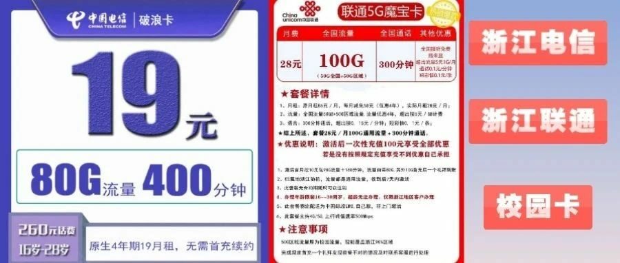 给大家盘点一下目前能办的校园卡套餐活动,今天先给大家介绍浙江电信和联通的校园卡活动。